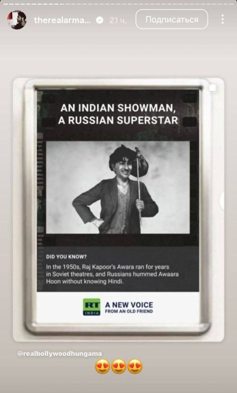 Внук индийского актера и режиссера Раджа Капура, которого знает и помнит каждый, кто родился в СССР, опубликовал фотографию рекламы RT India, посвященную его деду.