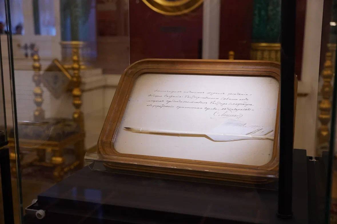 Среди них - гусиное перо, которым был подписан журнал заседания Общего собрания Государственного Совета об упразднении крепостного права.