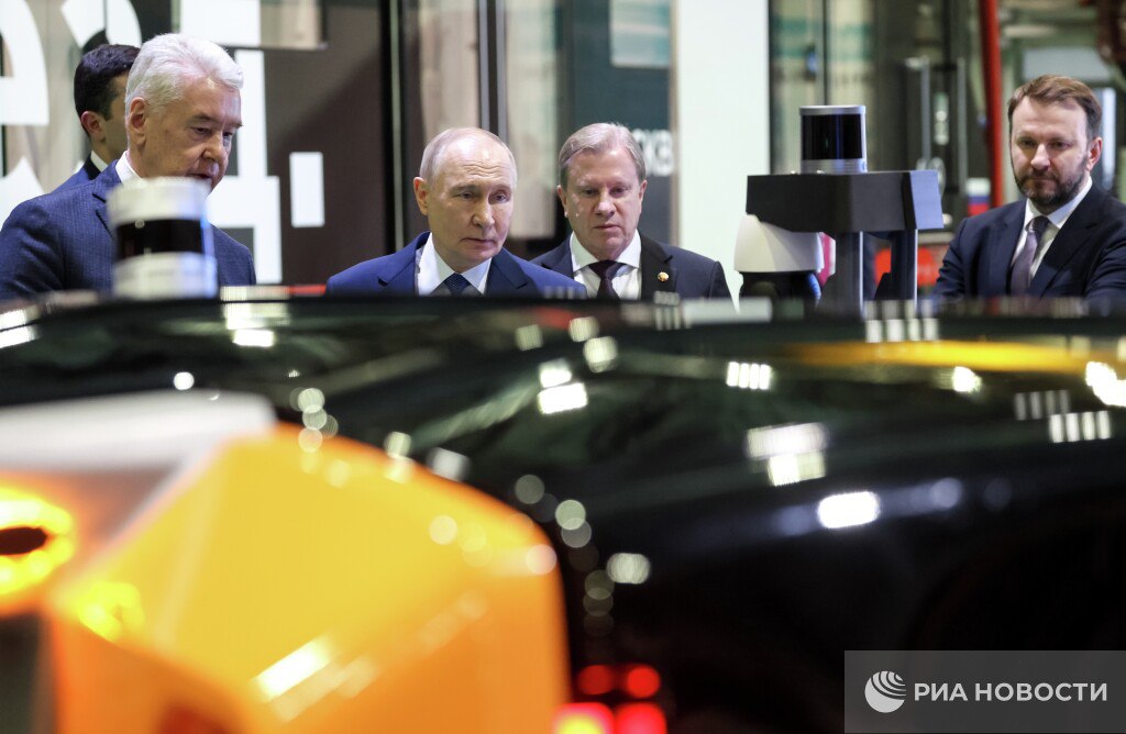 Путин приехал в электродепо "Аминьевское" и осматривает выставку гражданских беспилотных технологий.