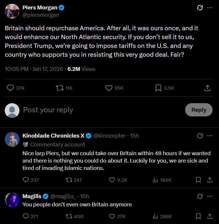 «Хороший спектакль, Пирс, но мы могли бы захватить Британию за двое суток. К счастью для тебя, нам надоело вторгаться в исламские страны», — написал один из сторонников Трампа.