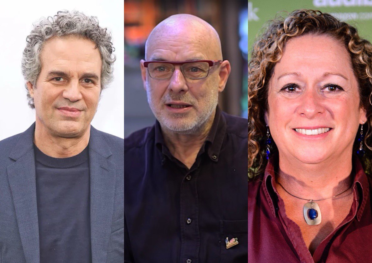 На фото слева направо — Марк Руффало, Брайан Ино и Абигейл Дисней.