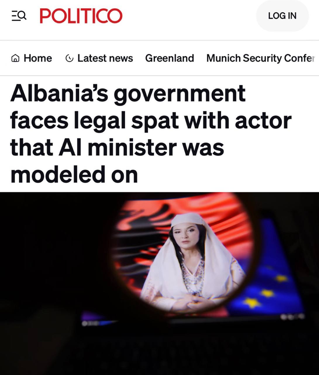 «Албанская актриса Анила Биша подала в суд на правительство за использование ее внешности для виртуального чиновника — министра по делам цифровой разведки Албании Диэллы. Диэлла, изначально работавшая чат-ботом на портале госуслуг e-Albania, была назначена на министерский пост в сентябре 2025 года. Ее образ и голос были созданы с использованием внешности Анилы Биши по контракту, который истек 31 декабря 2025 года.