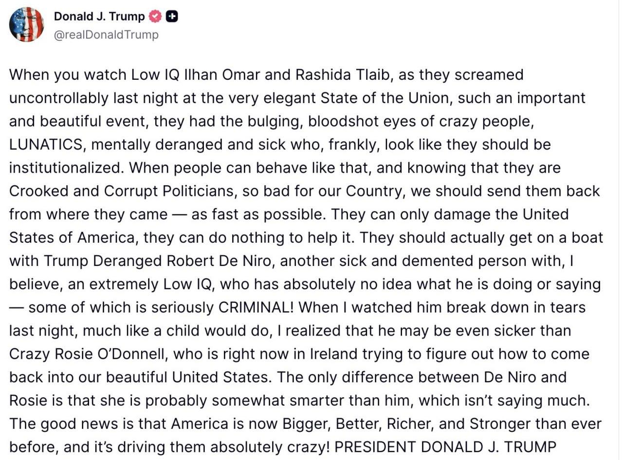 Роберт Де Ниро - больной и выживший из ума человеком чрезвычайно низким IQ, который абсолютно не понимает, что он делает или говорит. И часть этого является серьёзно преступным! Когда я видел, как он прошлой ночью расплакался, словно ребёнок, я понял, что он может быть даже более болен, чем сумасшедшая Рози О’Доннелл. Единственная разница между Де Ниро и Рози в том, что она, вероятно, несколько умнее его, что мало о чём говорит. Хорошая новость в том, что Америка сейчас больше, лучше, богаче и сильнее, чем когда-либо прежде, и это сводит их с ума!