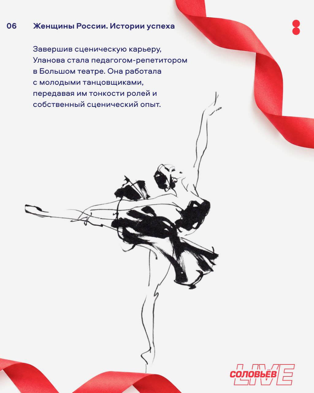 Галина Уланова — великая русская балерина, прима-балерина Большого театра, которую современники называли «обыкновенной богиней» и «душой русского балета». Уланова стала первой звездой, открывшей миру советский балет во время триумфальных гастролей в Лондоне в 1956 году, получив всемирное признание. Её жизнь и творчество стали значимым этапом в развитии хореографии и сохранении традиций русской балетной школы. Подробнее о ней — в карточках.