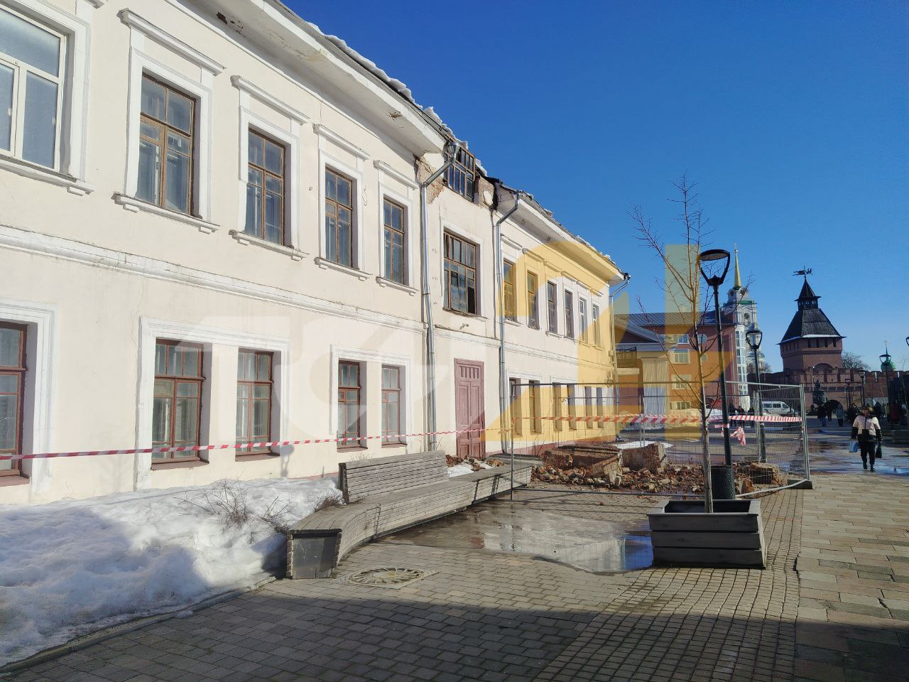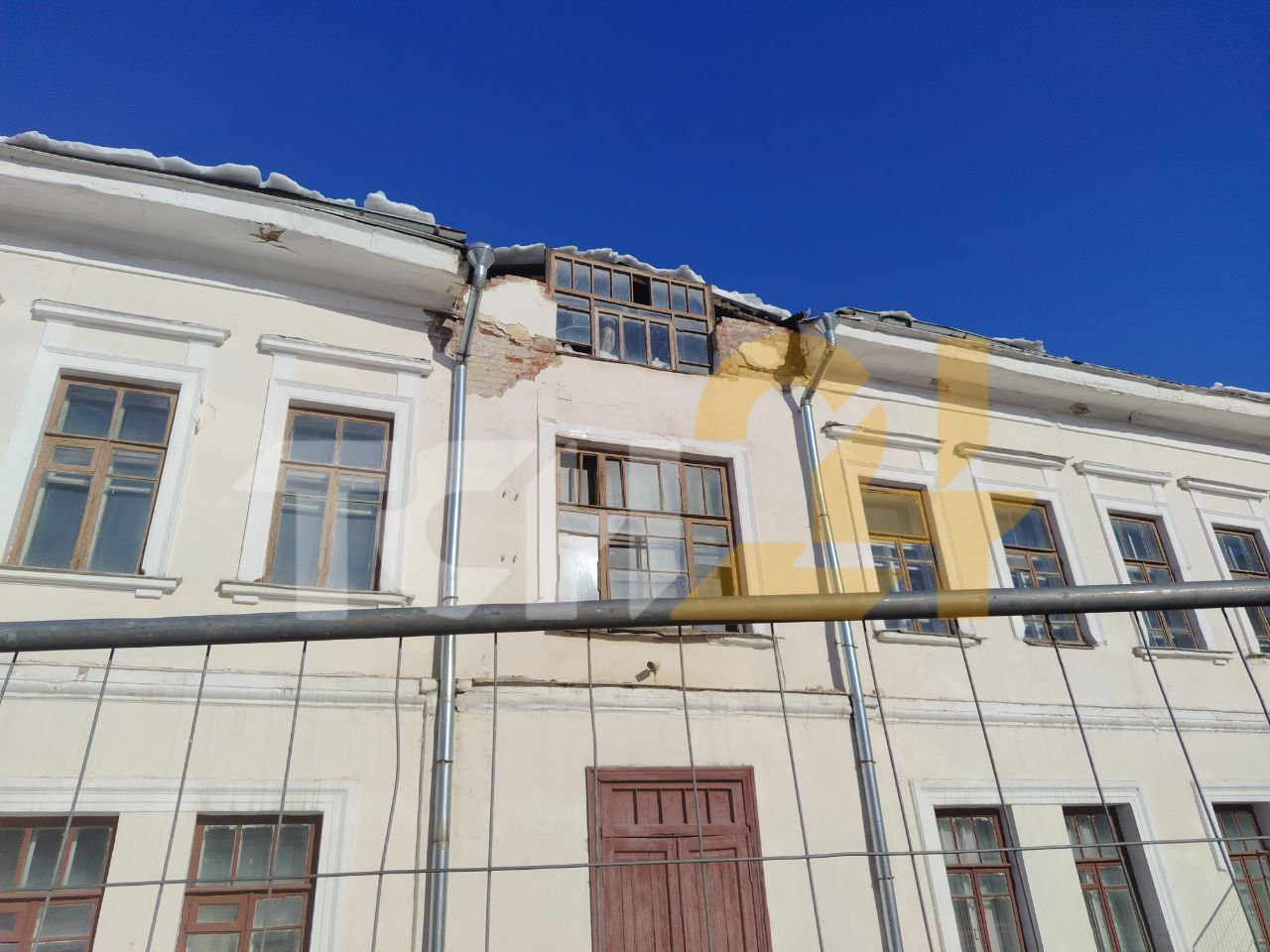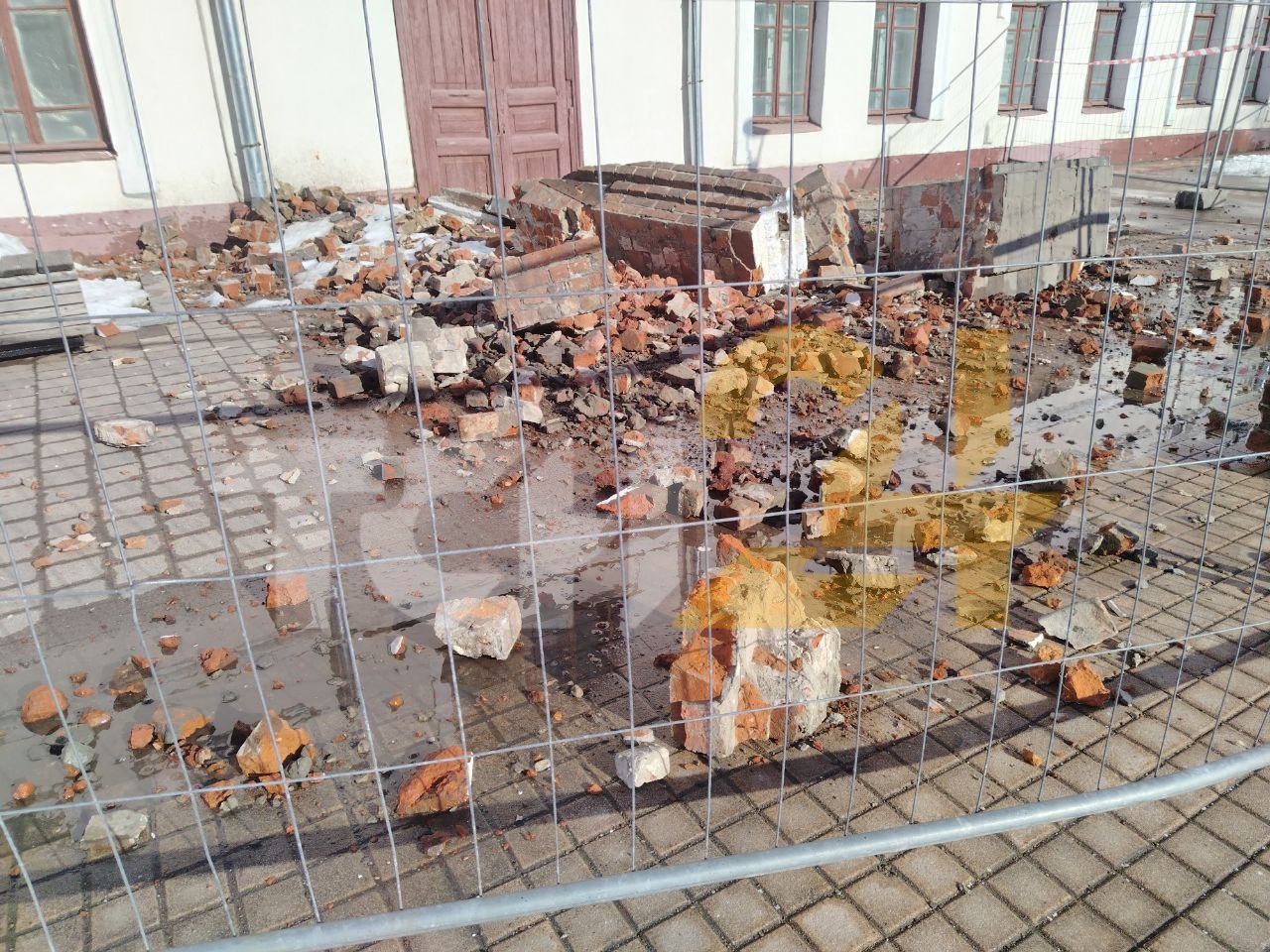 Предположительно, часть кровли и фасада могла обвалиться под тяжестью снега и льда. Сейчас территория огорожена.