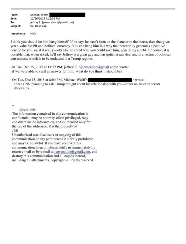 Второе сообщение от 2015 года. В нем Эпштейн ведет дискуссию с писателем Майклом Вульфом о стратегии поведения во время предвыборной кампании американского лидера. Вульф рекомендовал бизнесмену исходить из собственных заявлений республиканца и позволить ему "самому себя повесить", отвечая на вопросы о том, бывал ли он в поместье Эпштейна.