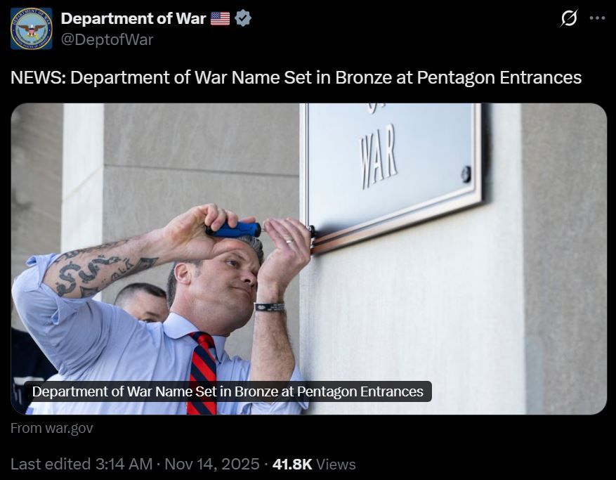 А пока что министр войны лично меняет таблички с названием департамента. Одну из них он прикрутил рядом со входом в министерство - фото опубликовал Пентагон. Всего на переименование будет израсходовано около двух миллиардов долларов из бюджета. Около половины потратят как раз на замену табличек и надписей.