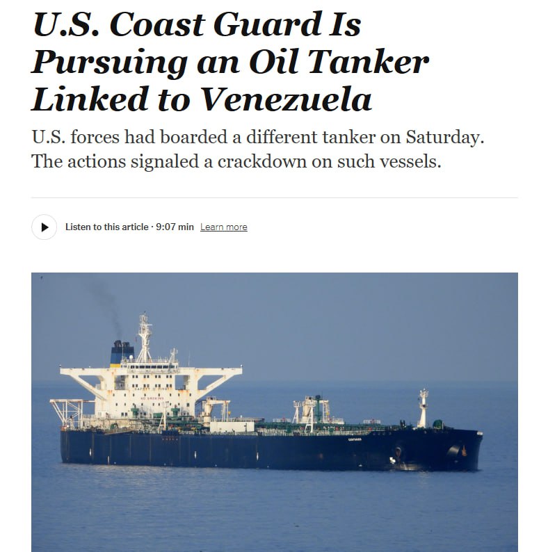 У побережья Венесуэлы в субботу американские военные пытались захватить еще один нефтяной танкер, но судну пока удается уйти от преследования. Об этом сообщает The New York Times со ссылкой на трёх американских чиновников.