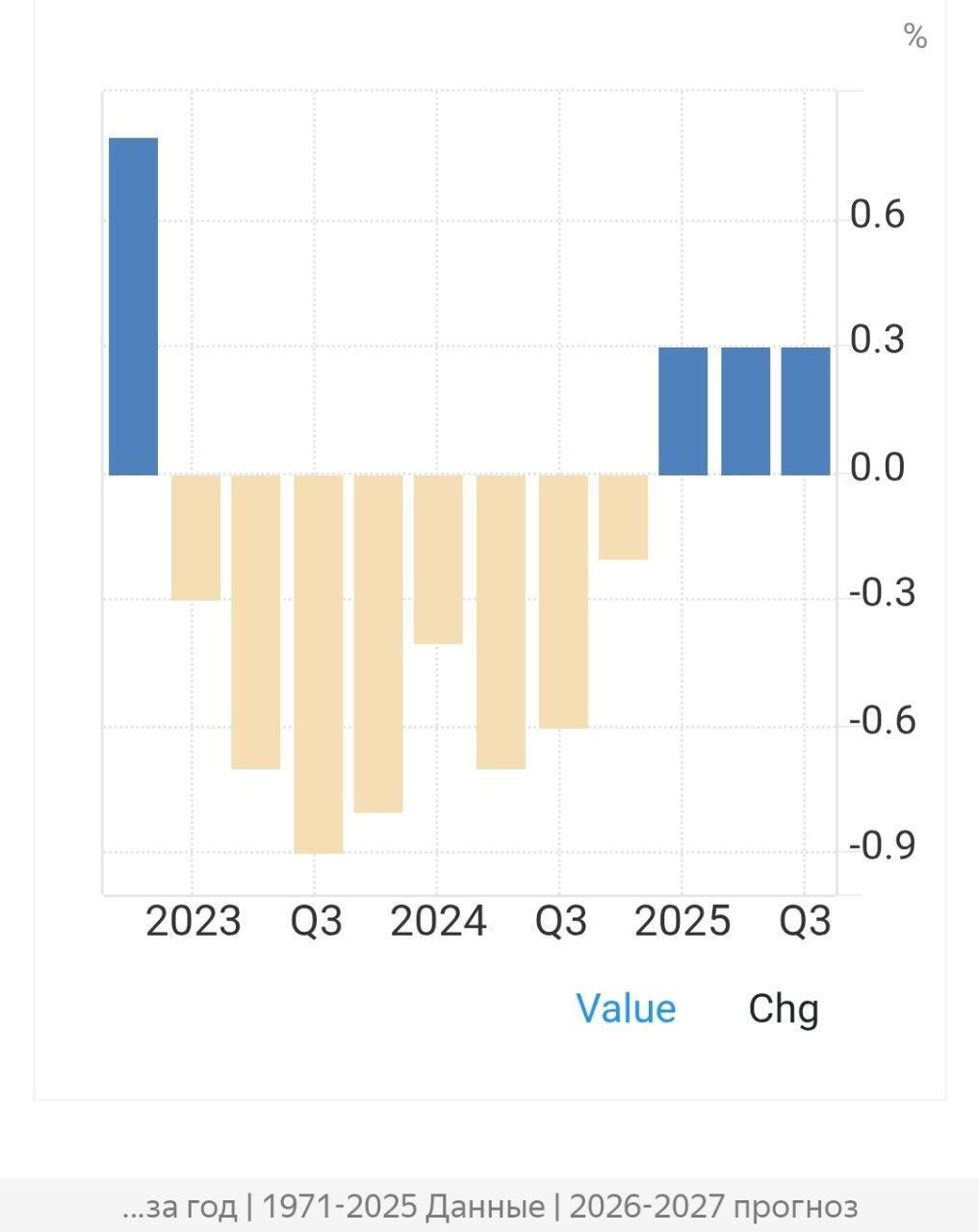 Политика разрыва энергетических связей с Россией, подрыв Северного потока-2, санкции и переход на более дорогостоящие энергоносители не проходят бесследно. За политику конфликта с Россией приходится платить. В 2023-2024 гг. "рост" был негативным: от - 0.3 до - 0.9 %. По оценке IFO, рост экономики страны в 2025 году составил 0.2%, по другим данным - 0.3%. Из промышленного локомотива Европы Германия превратилась в "больного человека" Европы.