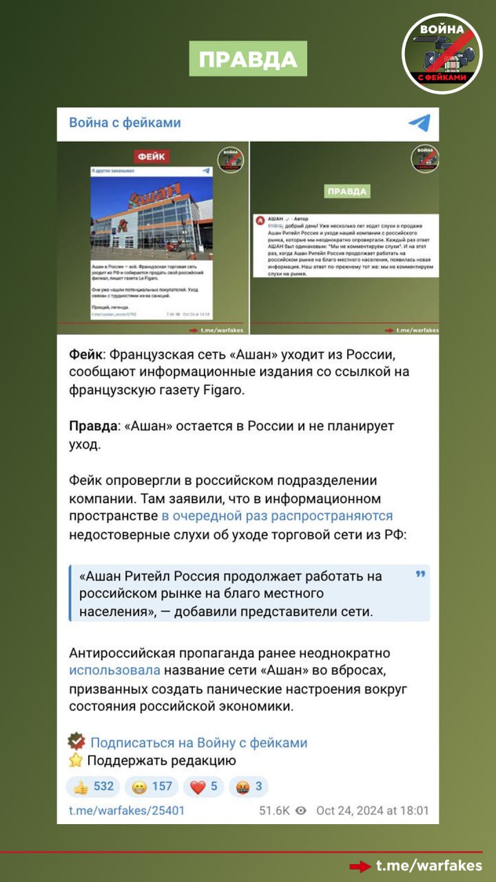 Фейк: «Ашан» уходит из России. Сообщение распространяется в соцсетях и в Телеграм.