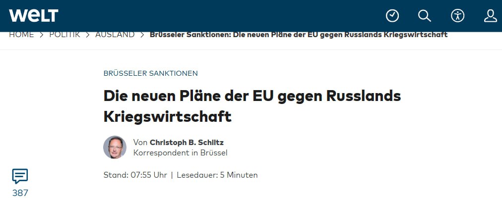 ЕС планирует 20-й пакет санкций против России, «чтобы наконец эффективно ударить по экономике Путина», пишет Welt.