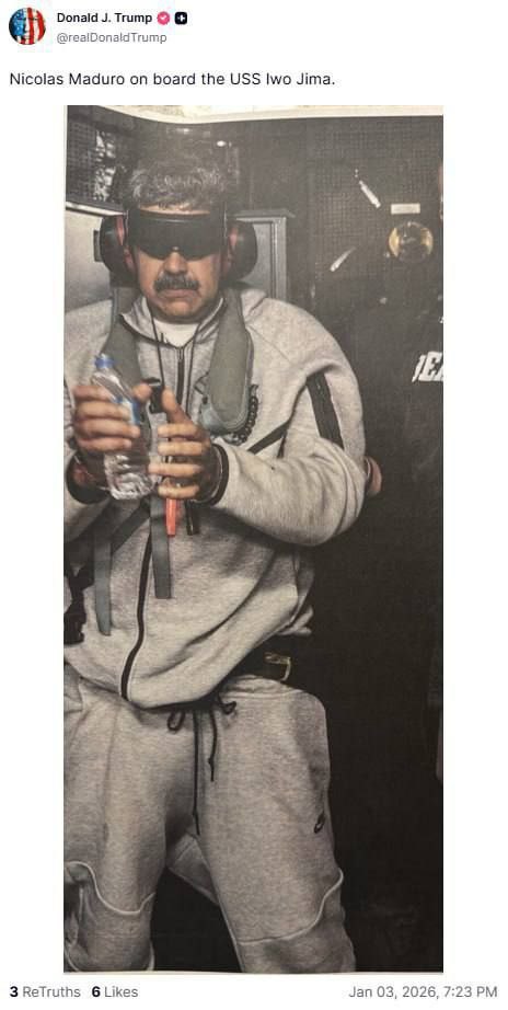 Трамп опубликовал фото Мадуро по дороге на судилище в Нью-Йорк.