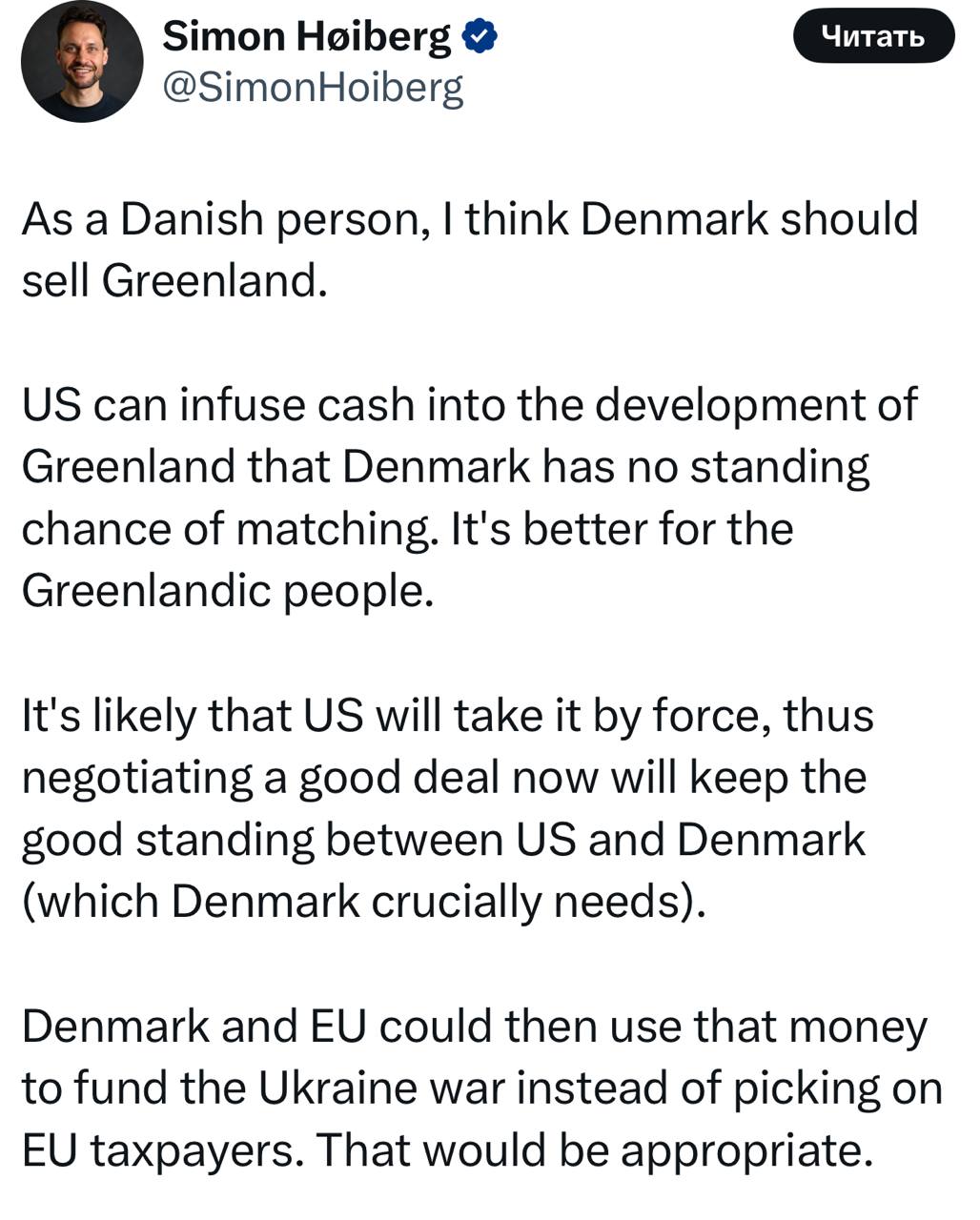 Некоторые датчане умеют в интересные комбинации - предлагается продать Гренландию, пока не поздно, США, а полученные деньги отдать Украине.