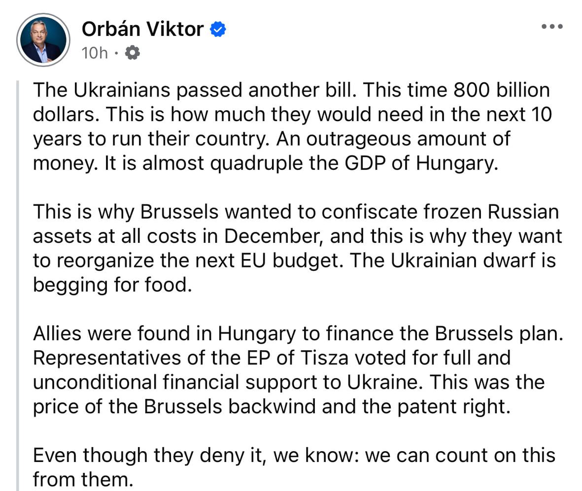 Премьер Венгрии заявил, что Брюссель стремился любой ценой изъять замороженные российские активы в декабре и ради этого сейчас готовит масштабные изменения бюджета ЕС.