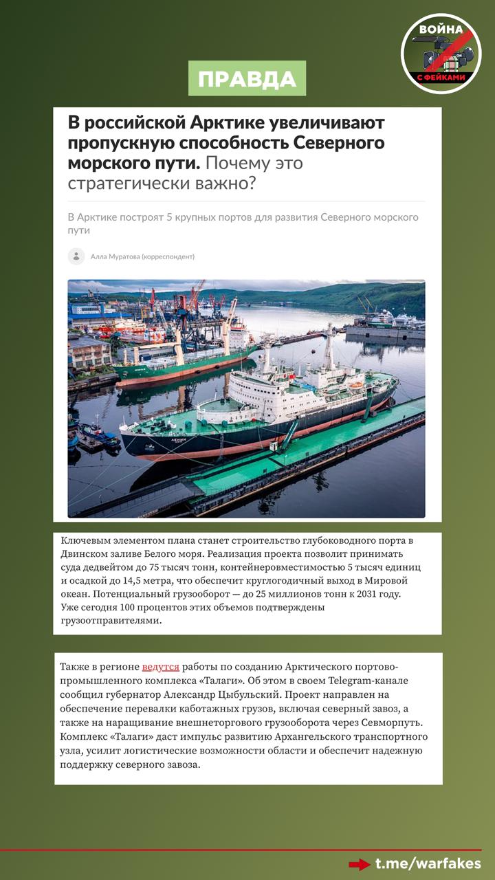 Фейк: Россия не может обеспечить надлежащие обслуживание своих портов в Арктике. Об этом пишут киевские СМИ со ссылкой на украинскую разведку.