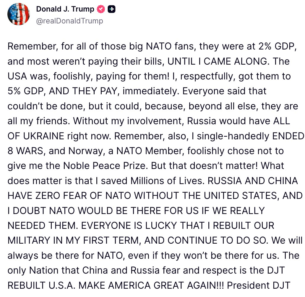 «Помните, для всех этих больших поклонников НАТО: они были на уровне 2% ВВП, и большинство из них не платили по счетам, пока не появился я. США по-глупому платили за них. Я, с должным уважением, довёл их до 5% ВВП, и они платят — сразу. Все говорили, что этого невозможно добиться, но это оказалось возможным, потому что, помимо всего прочего, они все мои друзья. Без моего участия Россия сейчас контролировала бы всю Украину. Помните также, что я в одиночку завершил восемь войн, а Норвегия, страна — член НАТО, по-глупому решила не присуждать мне Нобелевскую премию мира. Но это не имеет значения. Имеет значение то, что я спас миллионы жизней. Россия и Китай не испытывают никакого страха перед НАТО без Соединённых Штатов, и я сомневаюсь, что НАТО пришло бы нам на помощь, если бы мы действительно в ней нуждались. Всем повезло, что я восстановил наши вооружённые силы в свой первый срок и продолжаю делать это сейчас. Мы всегда будем рядом с НАТО, даже если они не будут рядом с нами. Единственная страна, которую Китай и Россия боятся и уважают, — это восстановленные мной Соединённые Штаты Америки».
