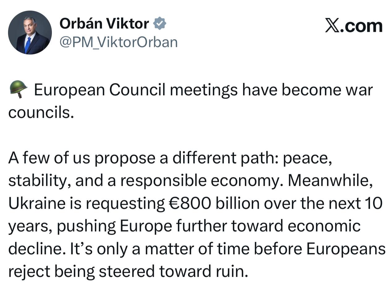 Заседания Европейского советапревратились в военные советы. Некоторые из нас предлагают другой путь: мир, стабильность и ответственная экономика. Тем временем Украина запрашивает 800 миллиардов евро в течение следующих 10 лет, что еще больше подталкивает Европу к экономическому спаду. Это только вопрос времени, когда европейцы откажутся от того, чтобы их вели к краху.