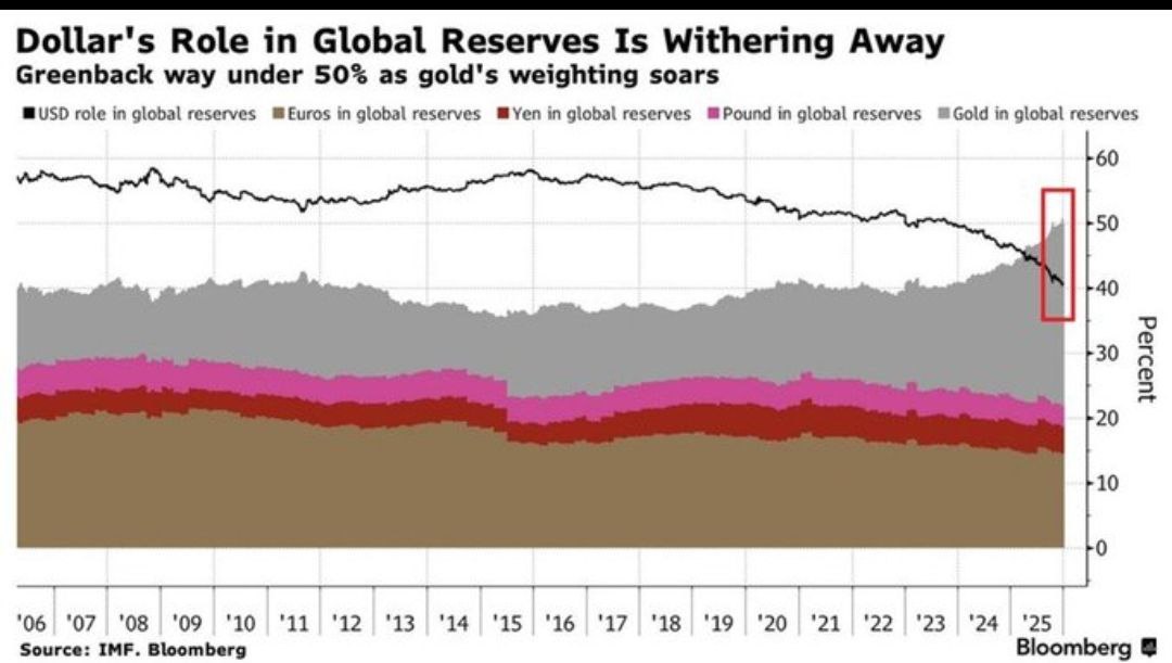 По последним данным МВФ, доллар составлял в 2025 году 56.9% мировых резервов, постепенно уступая позиции, прежде всего золоту. Однако агенство Блумберг публикует новые данные. Если исходить из них, доллар составляет сейчас лишь 40% мировых финансовых резервов, впервые в истории уступи место золоту, на которое приходится уже более 50 %.