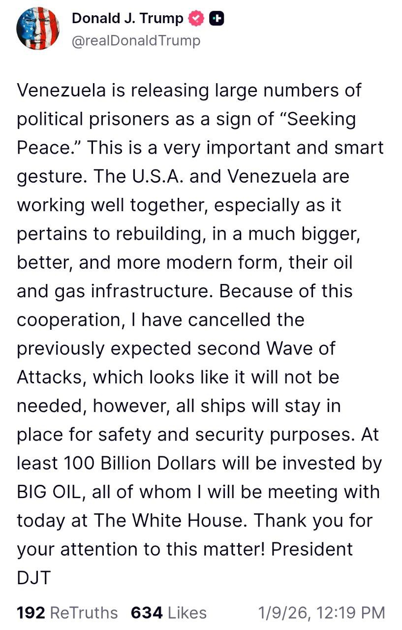 «Венесуэла освобождает большое количество политических заключенных в знак "стремления к миру". Это очень важный и разумный жест. США и Венесуэла хорошо сотрудничают, особенно в вопросе восстановления, в гораздо более масштабном, качественном и современном виде, своей нефтегазовой инфраструктуры. Благодаря этому сотрудничеству я отменил ранее ожидаемую вторую волну атак, которая, похоже, не понадобится, однако все корабли останутся на своих местах в целях безопасности. Крупные нефтяные компании инвестируют не менее 100 миллиардов долларов, со всеми из которых я сегодня встречусь в Белом доме. Спасибо за ваше внимание к этому вопросу!»