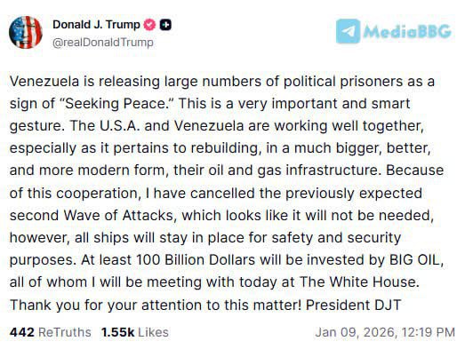 [Donald J. Trump] Венесуэла освобождает большое количество политических заключённых в знак «стремления к миру».