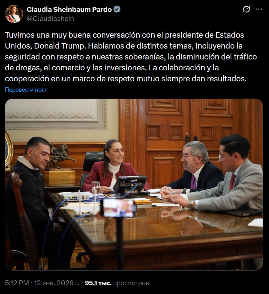 Президент Мексики Клаудия Шейнбаум сообщила, что провела конструктивный разговор с Дональд Трамп, в ходе которого они обсудили вопросы безопасности суверенитета страны.