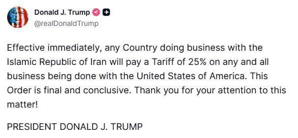 Начиная с сегодняшнего дня, любая страна, ведущая бизнес с Исламской Республикой Иран, будет платить тариф в размере 25% на все операции, осуществляемые с Соединенными Штатами Америки. Этот указ является окончательным и безоговорочным.