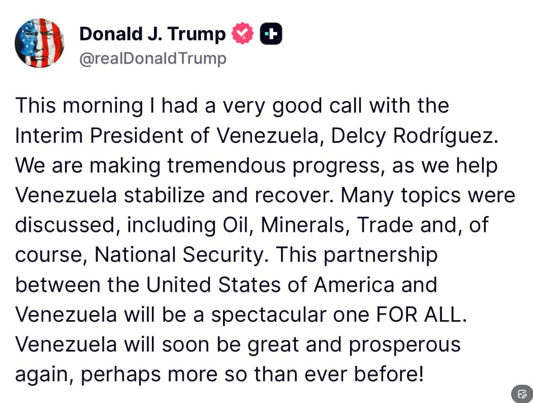 «Сегодня утром у меня был очень хороший звонок с исполняющей обязанности президента Венесуэлы Делси Родригес. Мы делаем огромные успехи, помогая Венесуэле стабилизироваться и восстанавливаться. Обсуждались многие темы, включая нефть, минералы, торговлю и, конечно, национальную безопасность. Это партнерство между Соединенными Штатами Америки и Венесуэлой будет потрясающим ДЛЯ ВСЕХ. Скоро Венесуэла снова станет великой и процветающей, возможно, даже больше, чем когда-либо прежде», – написал он в соцсети.