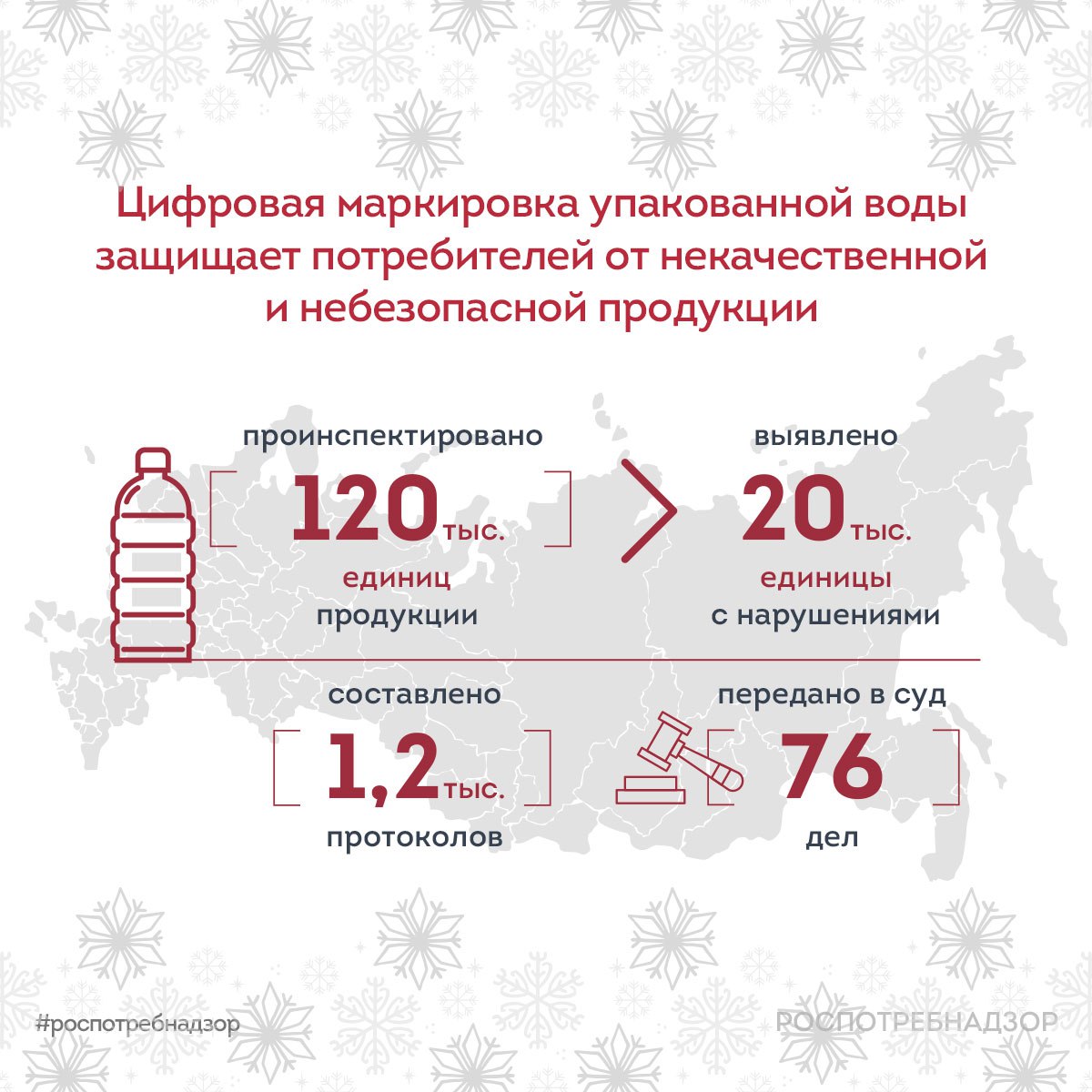 По утвержденным индикаторам риска Роспотребнадзор регулярно проводит проверки торговых объектов, реализующих бутилированную воду. В ходе проверок проинспектировано свыше 120 тыс. единиц продукции, из них около 20 тыс. оказались с нарушениями требований цифровой маркировки. По обнаруженным нарушениям составлено свыше 1,2 тыс. протоколов об административных правонарушениях, 76 административных дел передано в судебные органы.