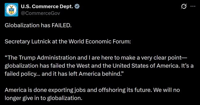 «Администрация Трампа и я здесь для того, чтобы очень четко заявить: глобализация подвела Запад и США. Это провальная политика… и она оставила Америку позади», — заявил министр торговли США Говард Лютник на Всемирном экономическом форуме в Давосе