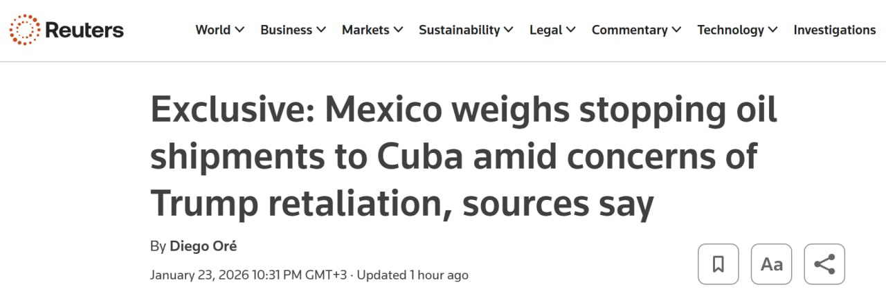 Эксклюзив Reuters: Мексика рассматривает возможность прекращения поставок нефти на Кубу на фоне опасений ответных мер со стороны Трампа, сообщают источники.