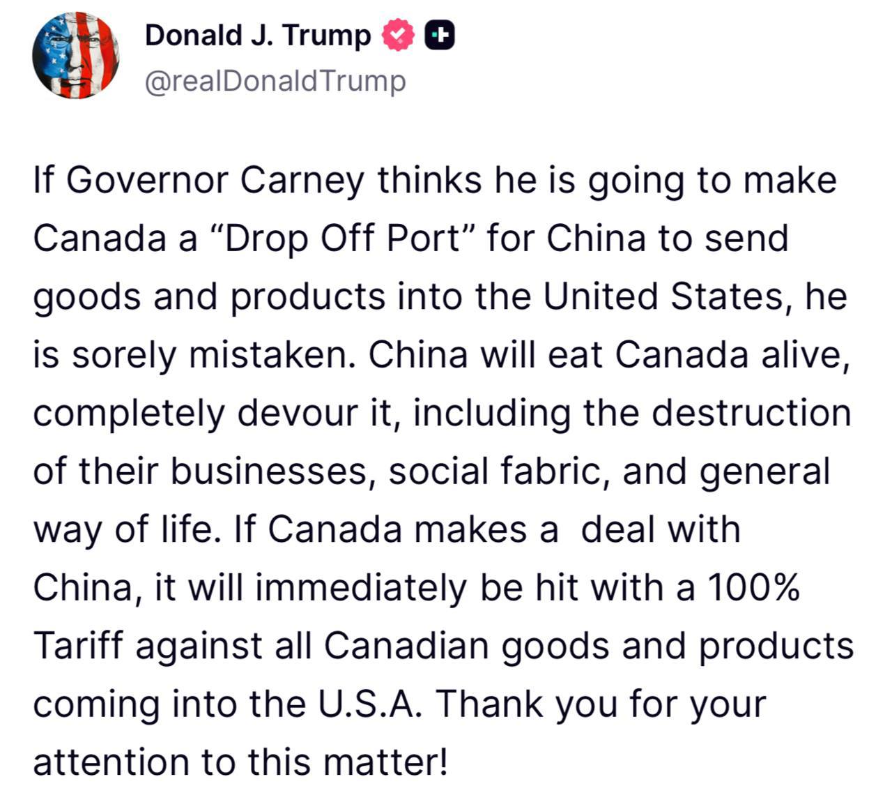 Если Канада заключит сделку с Китаем, на нее немедленно будут наложены 100%-ные пошлины на все канадские товары, ввозимые в США. Спасибо вам за ваше внимание к этому вопросу!