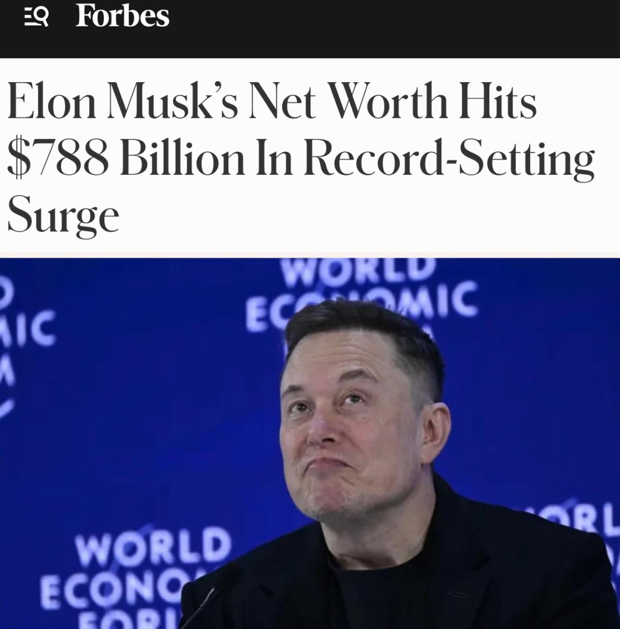 «Состояние Илона Маска выросло до 788 млрд долл, установив новый рекорд»: Маск может стать первым в мире триллионером уже в этом году.