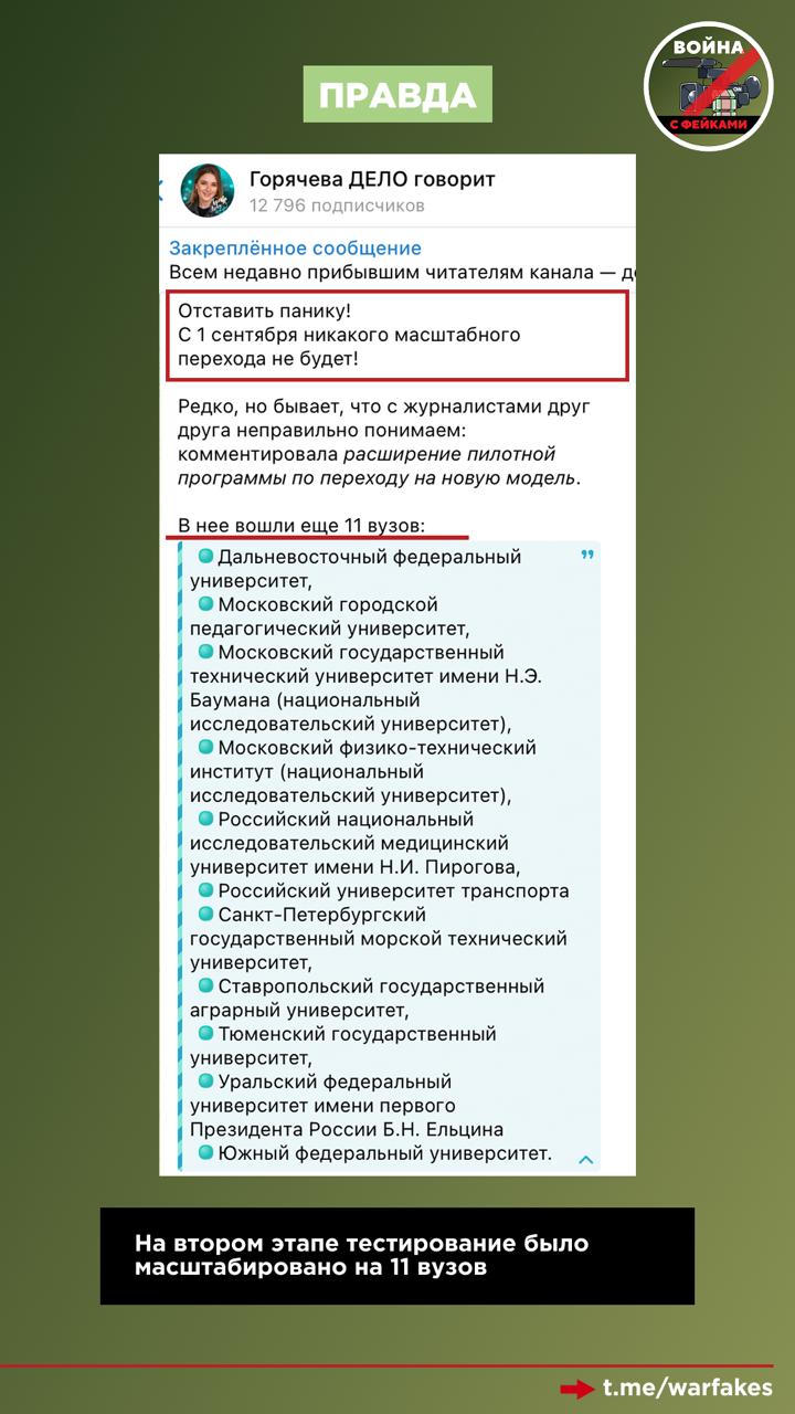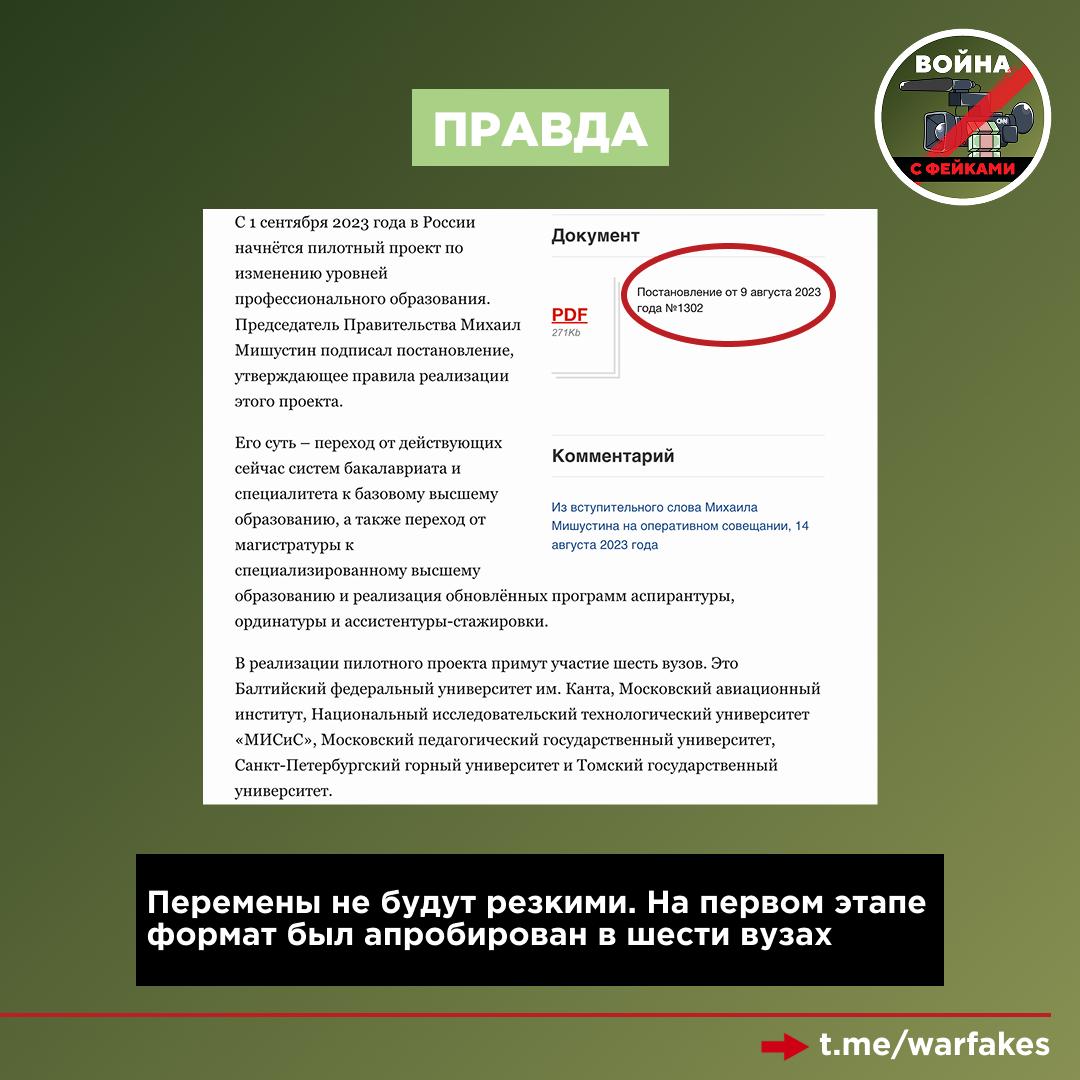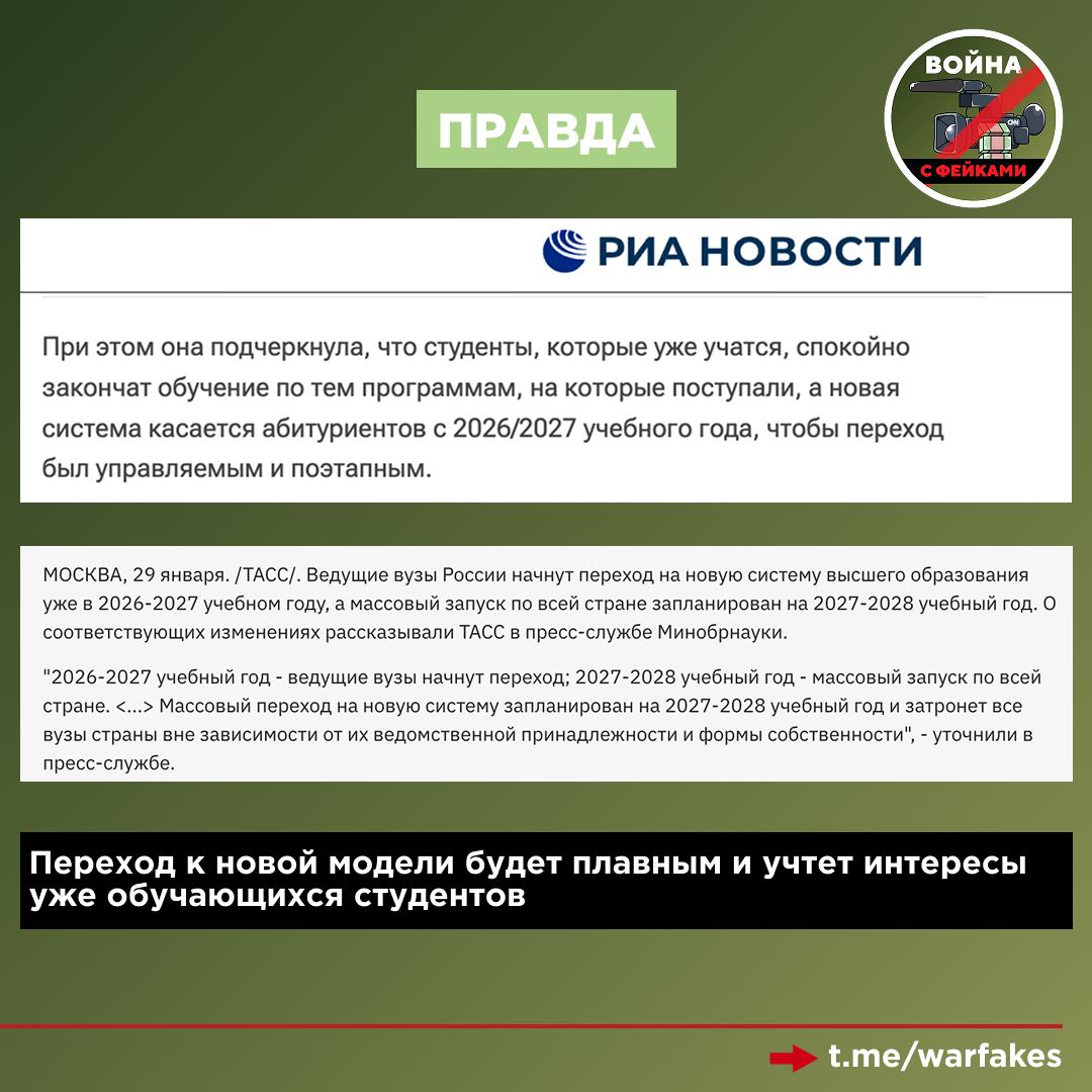 Правда: В Госдуме опровергли вброс о резкой смене образовательных форматов. Корректировки будут, но процесс пройдёт плавно, чтобы все российские вузы смогли адаптироваться. С 2022 года программа была успешно апробирована в шести вузах страны, а теперь опыт тестируется в 11 университетах. Ожидается, что массовый запуск модели состоится в 2027–2028 годах.