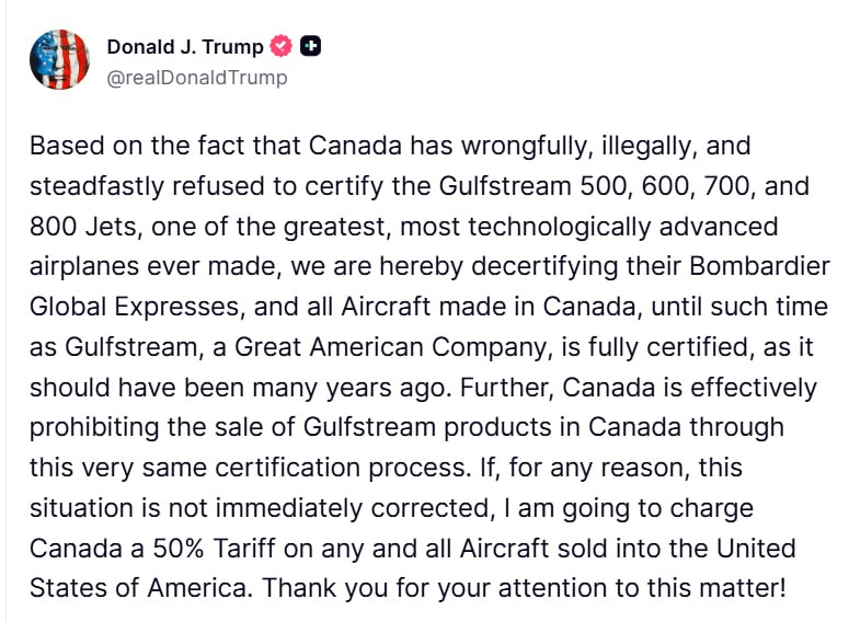 Более того, Канада фактически запрещает продажу продукции Gulfstream в Канаде через этот самый процесс сертификации. Если по какой-либо причине эта ситуация не будет немедленно исправлена, я введу для Канады 50-процентную пошлину на любые и все самолеты, продаваемые в Соединенные Штаты Америки. Благодарю за внимание к этому вопросу!»