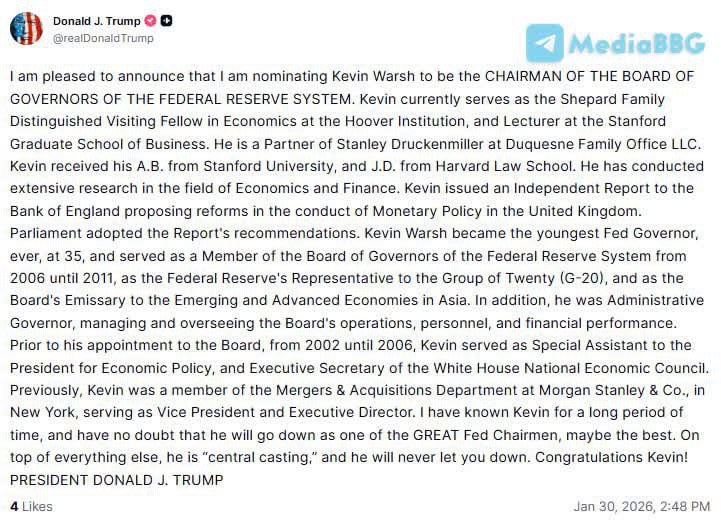 ![[Donald J. Trump] Я рад сообщить, что назначаю Кевина Уорша ПРЕДСЕДАТЕЛЕМ СОВЕТА УПРАВЛЯЮЩИХ ФЕДЕРАЛЬНОЙ РЕЗЕРВНОЙ СИСТЕМЫ](https://nmosknews.ru/img/20260130/c963785c1626719d46ac7261cc880371_o.jpg)