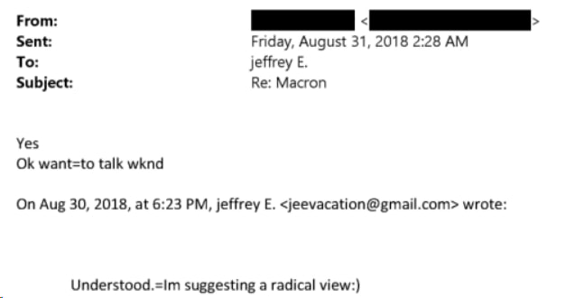 Свои дела с финансистом политик обсуждал в переписке, которая датируется августом 2018 года. Судя по файлам, Эпштейн выступал посредником для установления контактов между американскими бизнесменами и администрацией Макрона в обход официальных каналов.