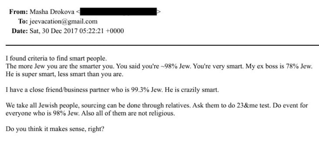 «Я нашла критерий, как находить умных людей.Чем больше в тебе еврейского происхождения, тем ты умнее. Ты говорил, что ты примерно на 98% еврей. Ты очень умный. Мой бывший начальник — на 78% еврей. Он суперумный, хотя и не такой умный, как ты.