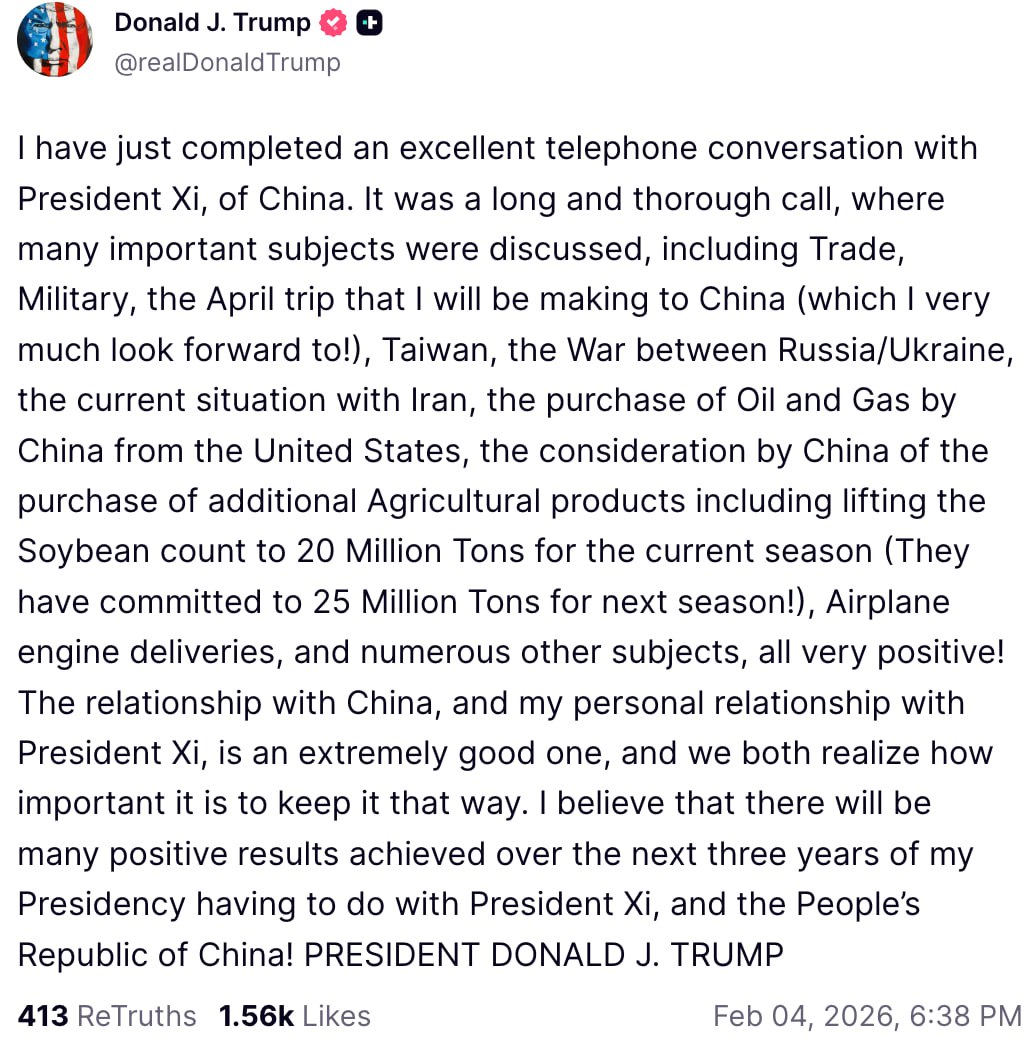 Я только что завершил отличный телефонный разговор с председателем КНР Си. Это был долгий и обстоятельный звонок, в ходе которого мы обсудили множество важных тем, включая торговлю, военные вопросы, апрельскую поездку, которую я собираюсь совершить в Китай [которой я очень жду!], Тайвань, войну между Россией и Украиной, текущую ситуацию с Ираном, закупки Китаем нефти и газа у Соединённых Штатов, рассмотрение Китаем возможности закупки дополнительных сельскохозяйственных товаров, включая увеличение объёма закупок сои до 20 миллионов тонн в текущем сезоне [они взяли на себя обязательство закупить 25 миллионов тонн в следующем сезоне!], поставки авиационных двигателей и множество других тем все в исключительно позитивном ключе.