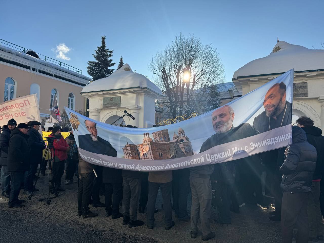 У здания посольства Армении в Москве прошла акция протеста в поддержку Армянской апостольской церкви и против действий властей республики. Митинг совпал с визитом в Россию председателя парламента Армении.