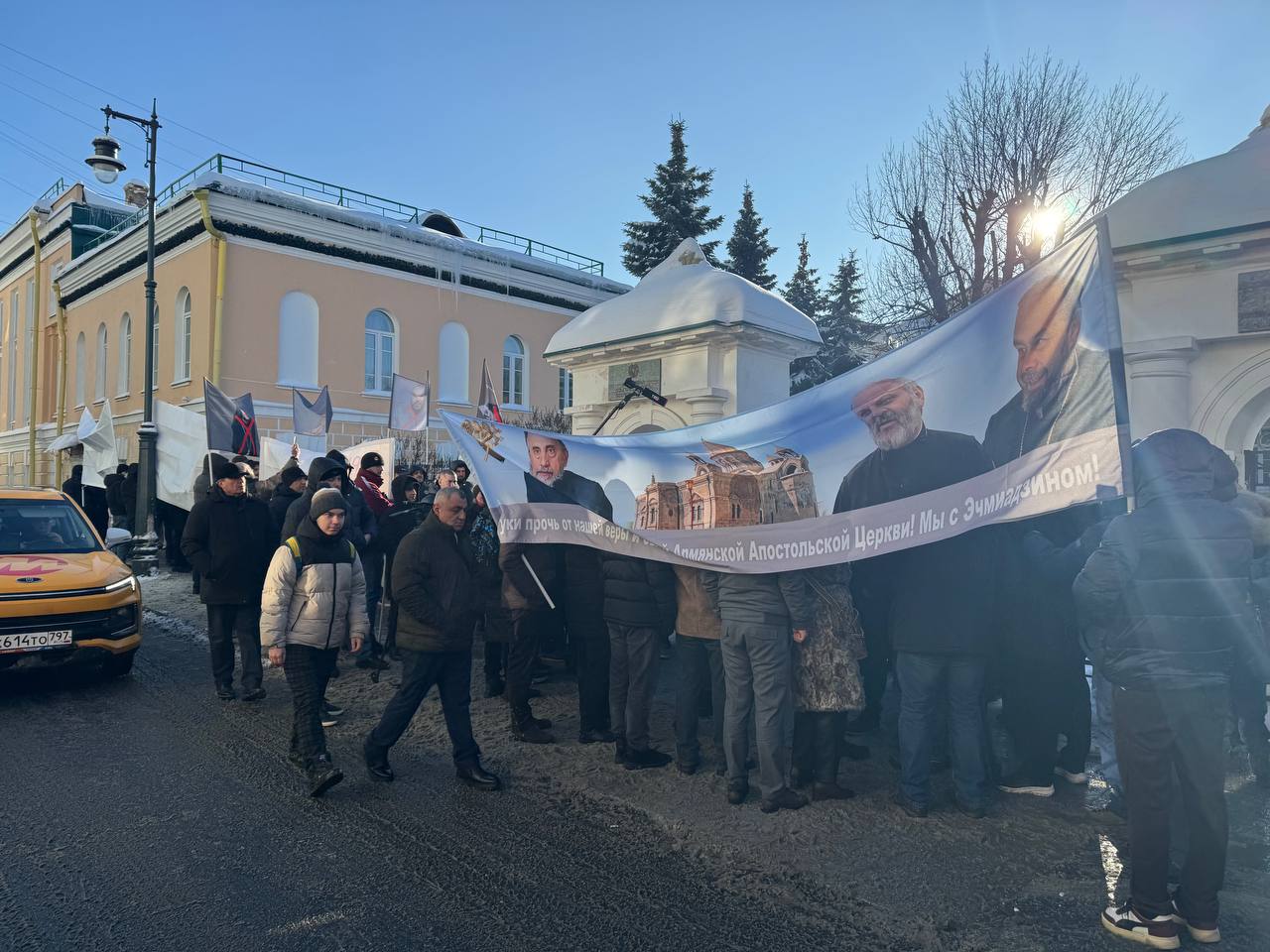 В пикете приняли участие до 200 человек — собравшиеся скандировали: «Защитим нашу Церковь!», «Руки прочь от Святого Эчмиадзина!», «Свободу священнослужителям!».