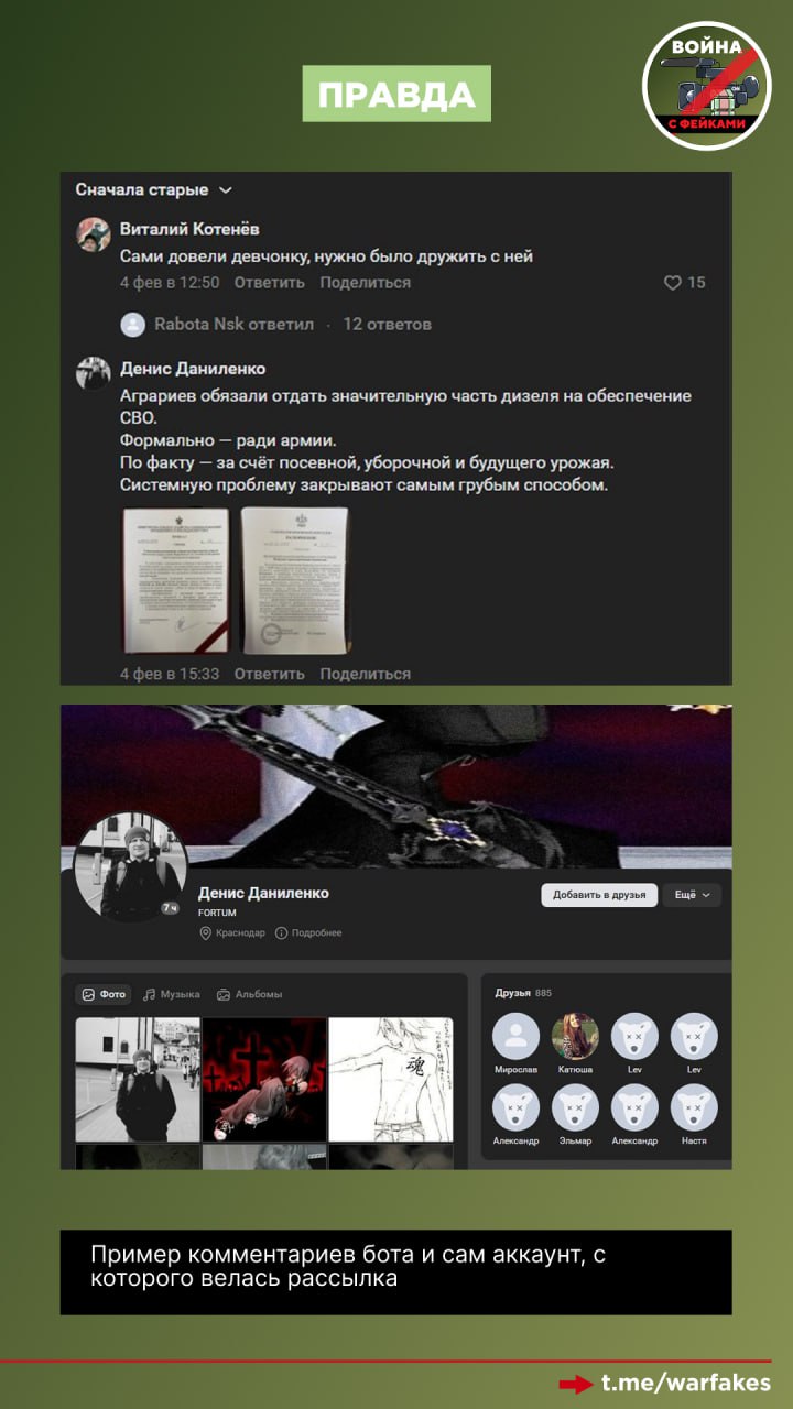 Стоит обратить внимание на то, что фейк рассылается также с помощью ботов в комментариях под разными постами в группах соцсетей. Цель этого посева — раскидать подделку по регионам перед стартом посевного сезона, чтобы спровоцировать недовольство граждан.
