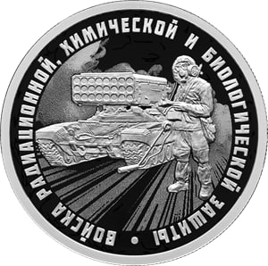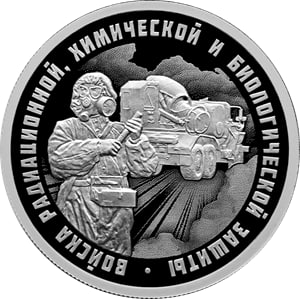 На оборотной стороне монет расположено рельефное изображение войск РХБЗ.