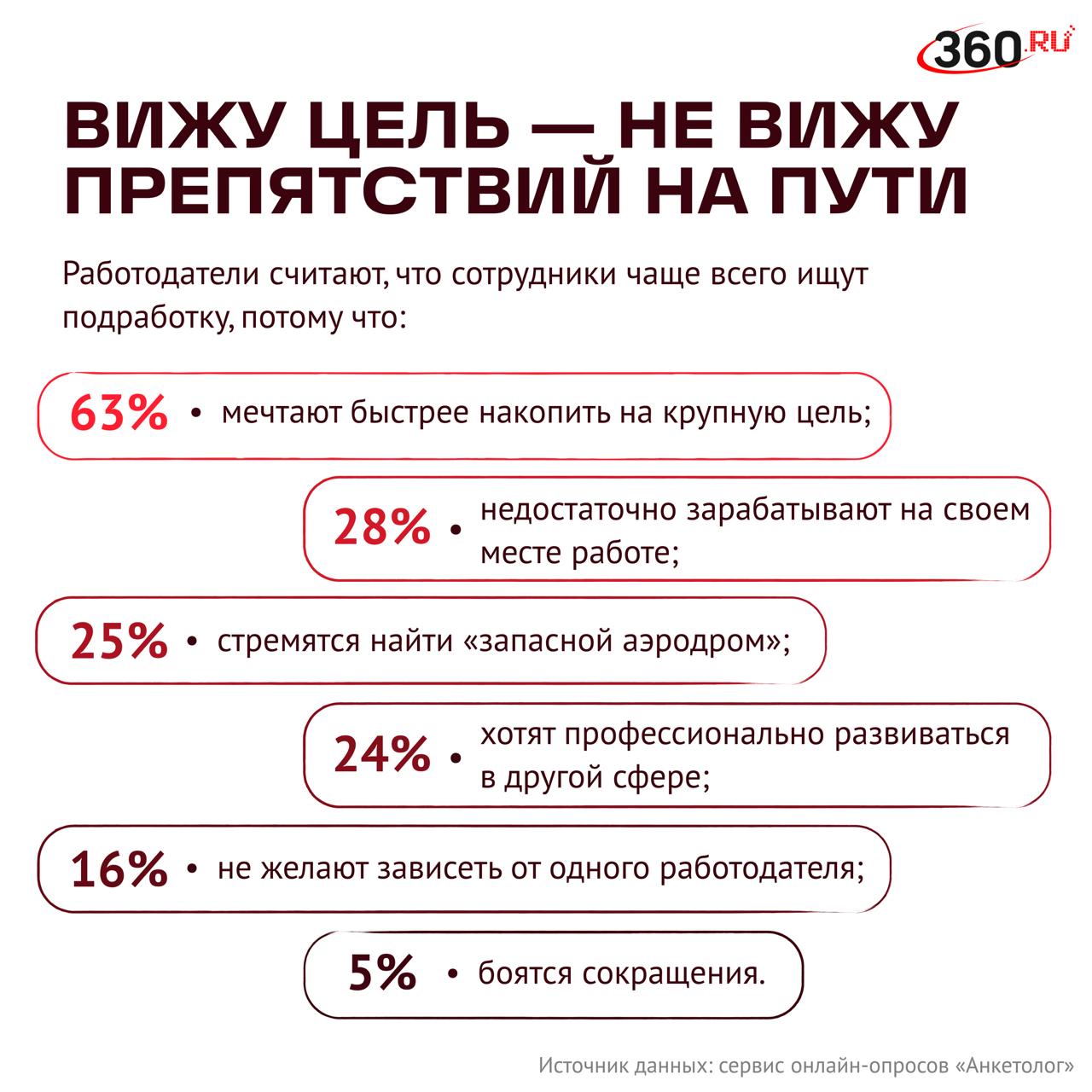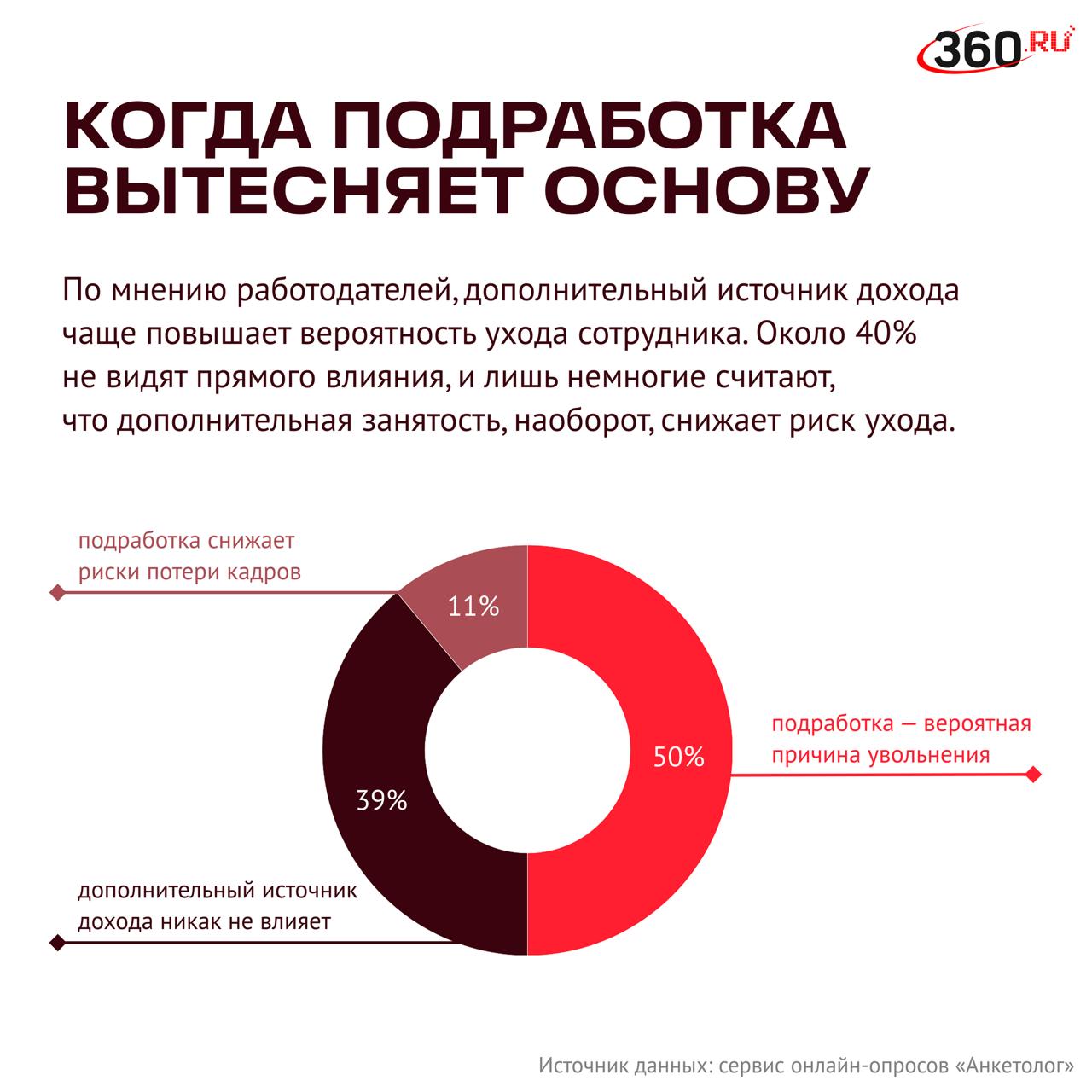 Люди все чаще ищут дополнительный источник заработка, а наниматели спокойнее относятся к тому, что сотрудники работают в двух компаниях. 65% работодателей считают, что у их специалистов есть подработки. Чаще всего руководители узнают о дополнительной занятости от самих сотрудников, определил сервис онлайн-опросов «Анкетолог» @iom_anketolog.