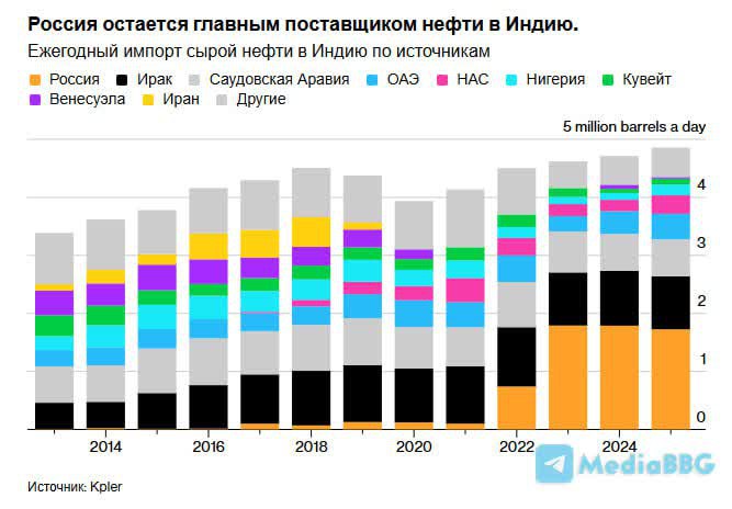 ОЖИДАЕТСЯ, ЧТО ИМПОРТ РОССИЙСКОЙ НЕФТИ В ИНДИЮ СОКРАТИТСЯ ВДВОЕ ПОСЛЕ РАСПОРЯЖЕНИЯ БЕЛОГО ДОМА. [Bloomberg]