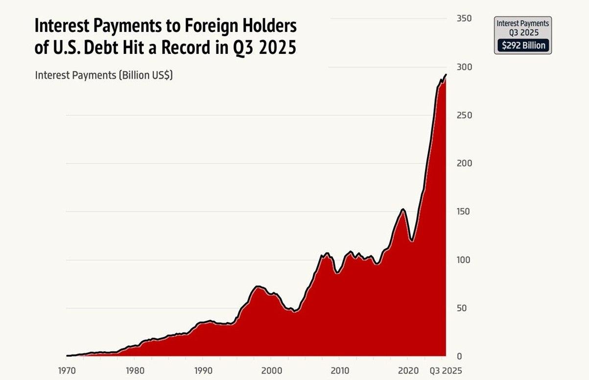 292 млрд долларов — рекордные для третьего квартала процентные выплаты по госдолгу США иностранным инвесторам в 2025 году, — констатирует аналитическая компания The Kobeissi Letter (TKL)С 2020 года эта сумма выросла более чем в два раза и в шесть раз — со времён финансового кризиса 2008 года