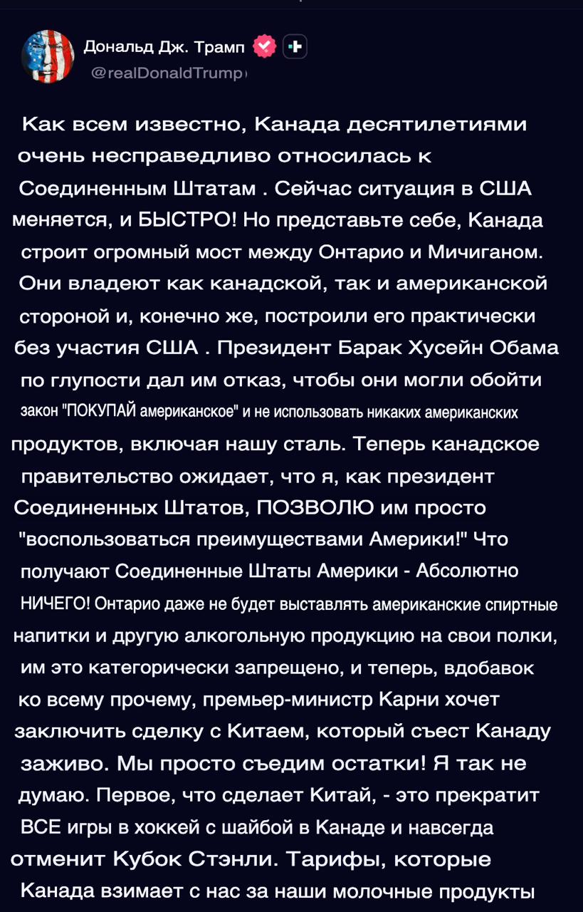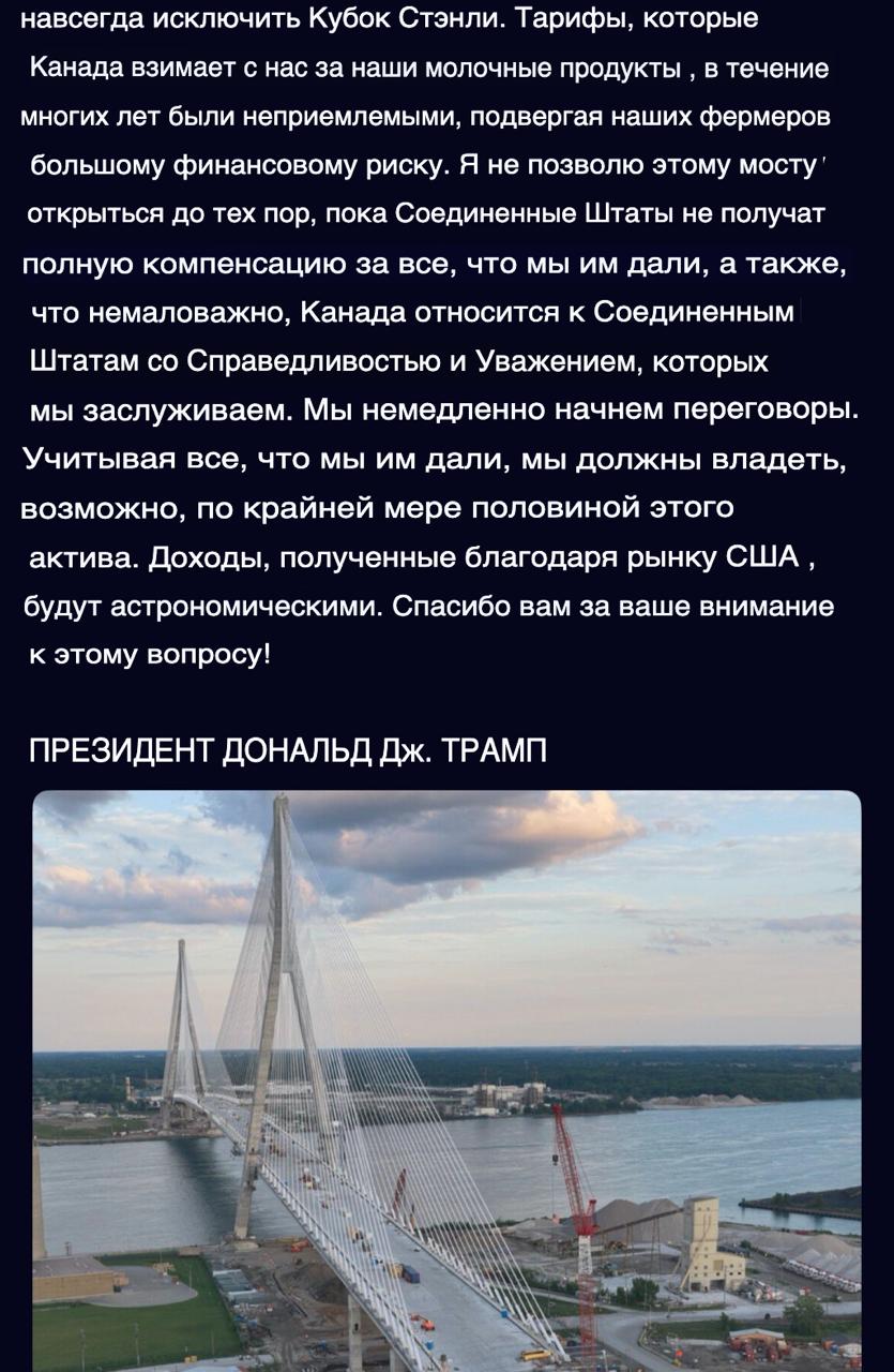 Дональд Трамп шантажирует Канаду и угрожает перекрыть мост Горди Хоу, пока американцы не получат как минимум половину прав собственности на объект.