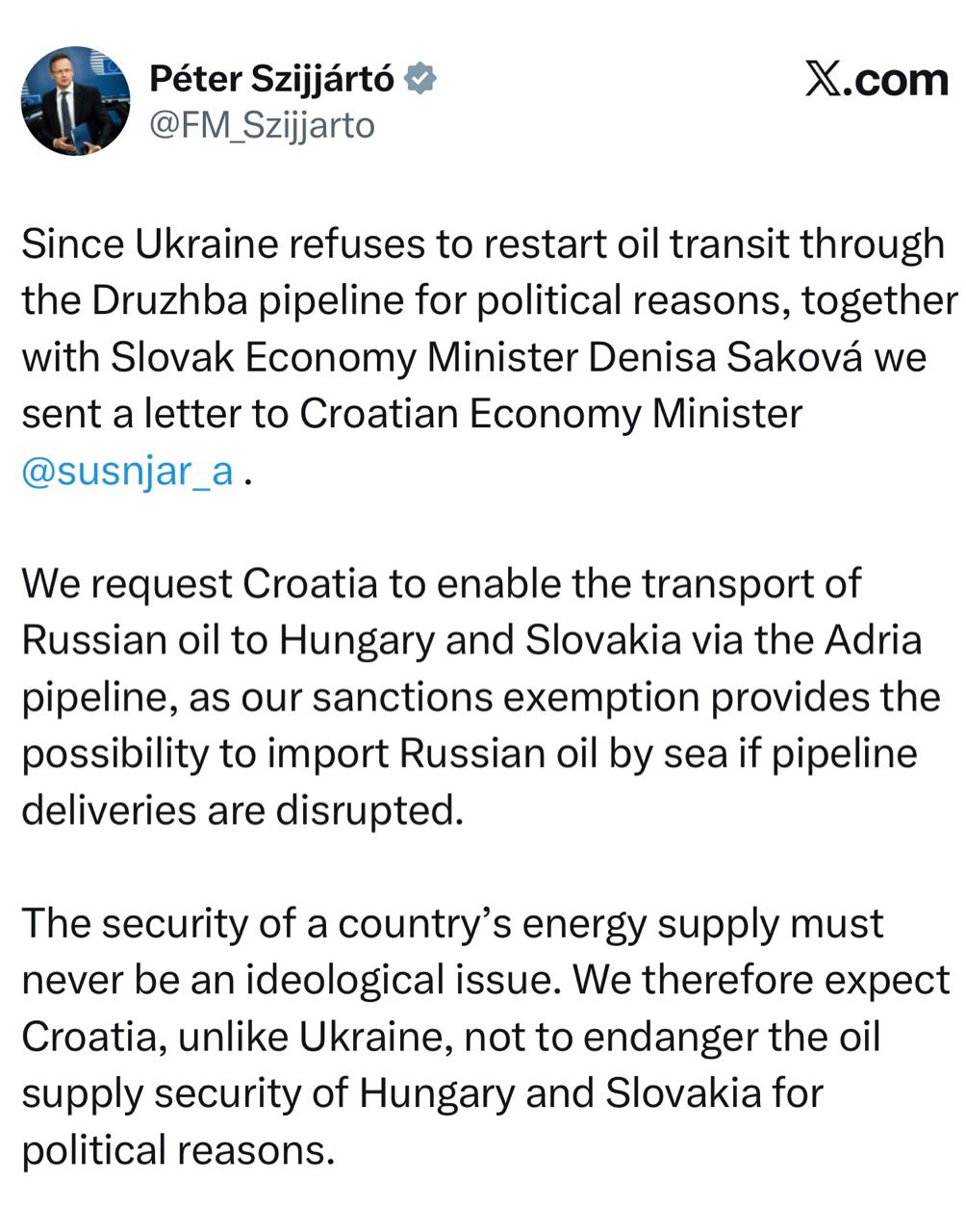 Глава МИД Венгрии Сийярто - попросил Хорватию об открытии альтернативного маршрута поставок российской нефти: