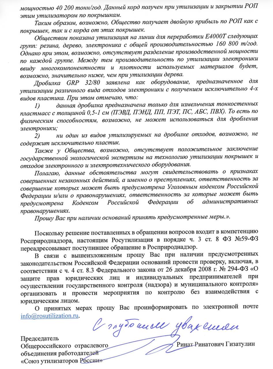 «Союз утилизаторов России», ссылаясь на закон о порядке рассмотрения обращений граждан, переадресовал жалобу в Росприроднадзор и просит «при наличии предусмотренных законодательством Российской Федерации оснований провести проверку», включая мероприятия без взаимодействия с юридическим лицом.