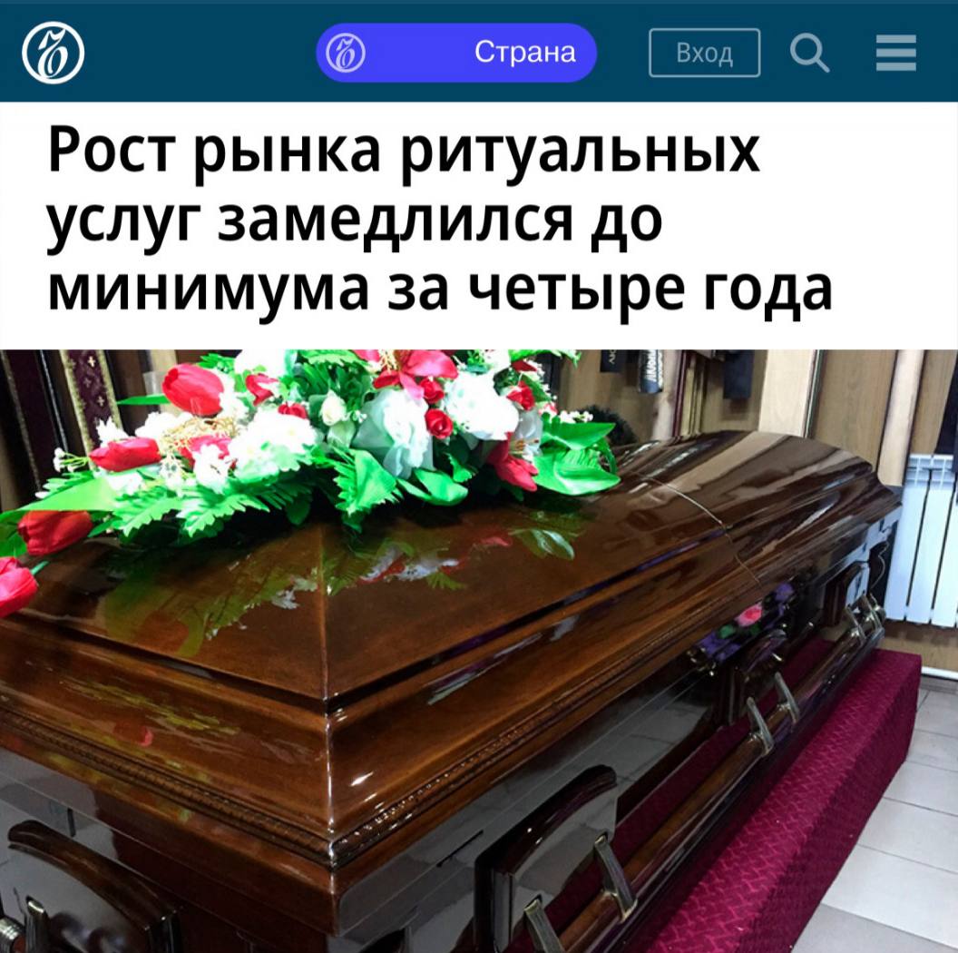 «По итогам 2025 года рынок ритуальных услуг в России в сопоставимых ценах вырос на 3,3%, до 128,3 млрд рублей. Это минимальное увеличение за четыре года. Эксперты связывают стагнацию рынка с окончанием ковидного всплеска и падением доходов населения. «Раньше рынок рос огромными темпами из-за пандемии, а сейчас смертность почти не растет», - пояснил директор Института исследования проблем современной политики Орлов.