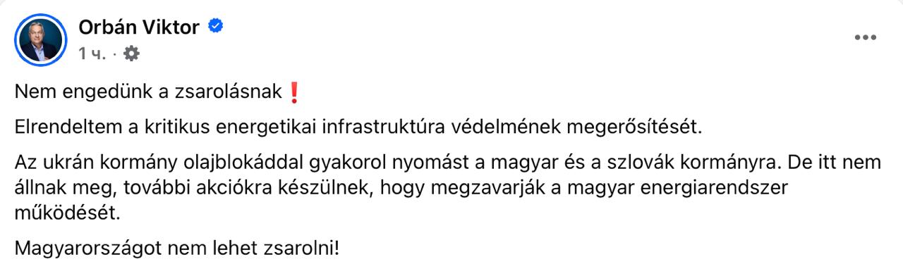 Мы не поддадимся шантажу. Я распорядился усилить защиту критически важной энергетической инфраструктуры. Правительство Украины оказывает давление на правительства Венгрии и Словакии посредством нефтяной блокады. И на этом они не намерены останавливаться — готовятся новые шаги, направленные на дестабилизацию работы венгерской энергосистемы.